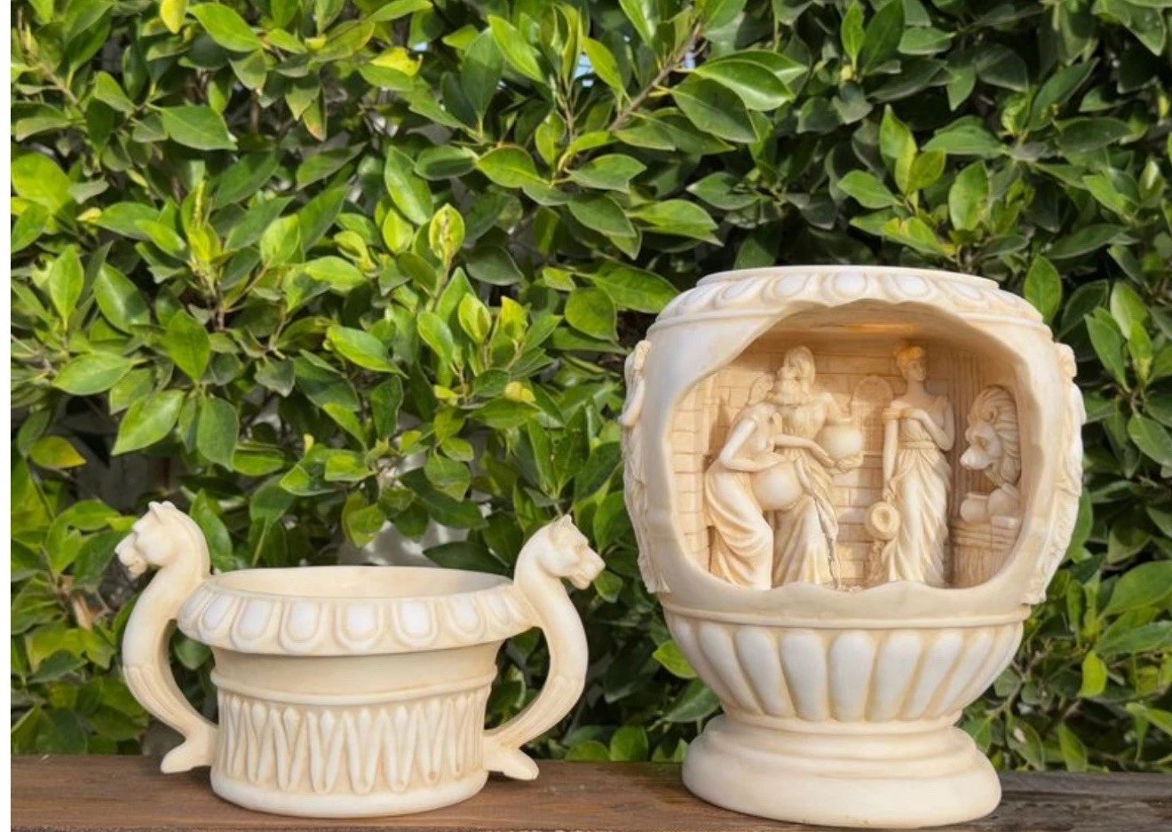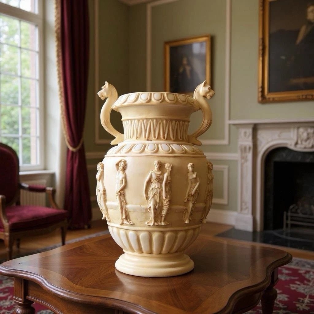 Crafted from hand-painted, high-quality polyresin using original molds, this understated yet striking piece features sculpted figures, classical motifs, and a graceful lion’s head—each detail echoing the myth of endless endurance.
